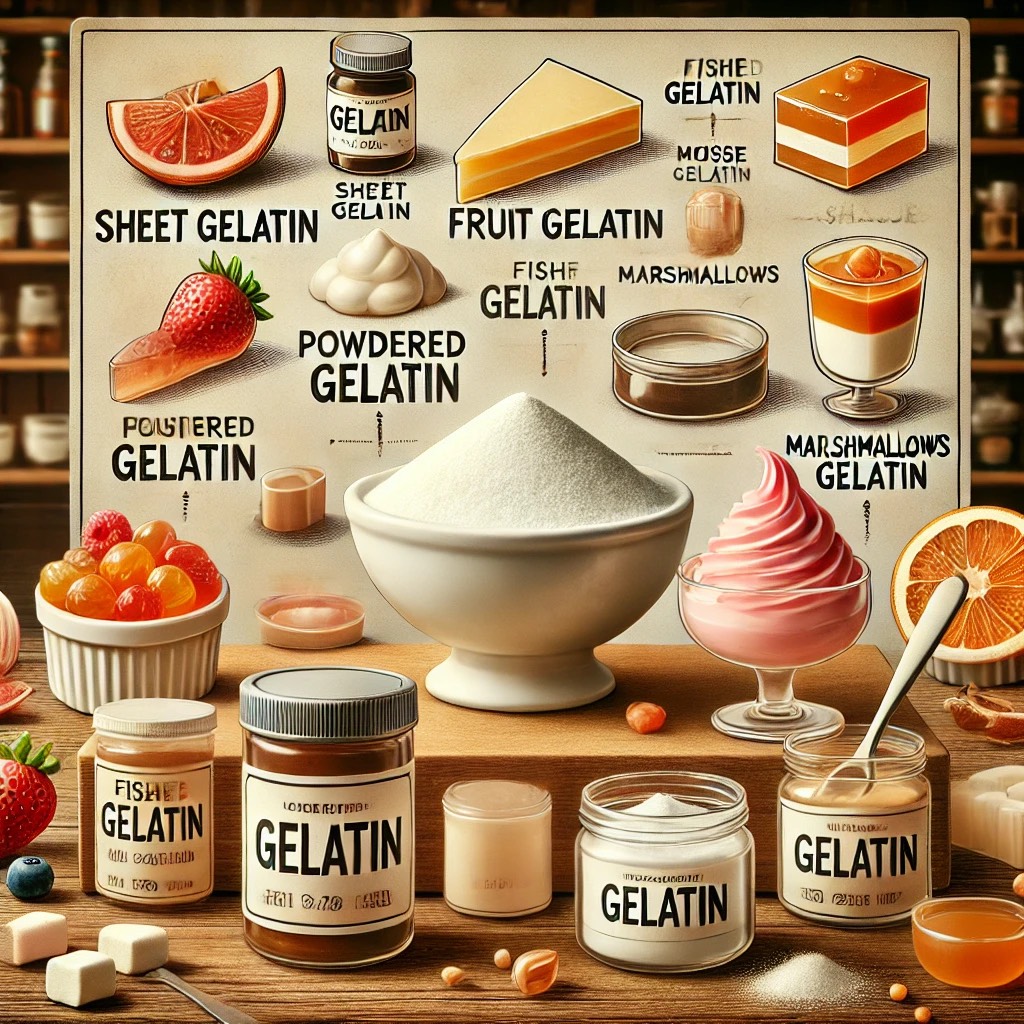 Jelatin, hayvansal kaynaklı bir protein olup, kollajenden elde edilir ve su ile birleştiğinde jelleşme özelliği gösterir. Özellikle pastacılık, çikolata, şekerleme ve gastronomi dünyasında kıvam verici olarak kullanılır.